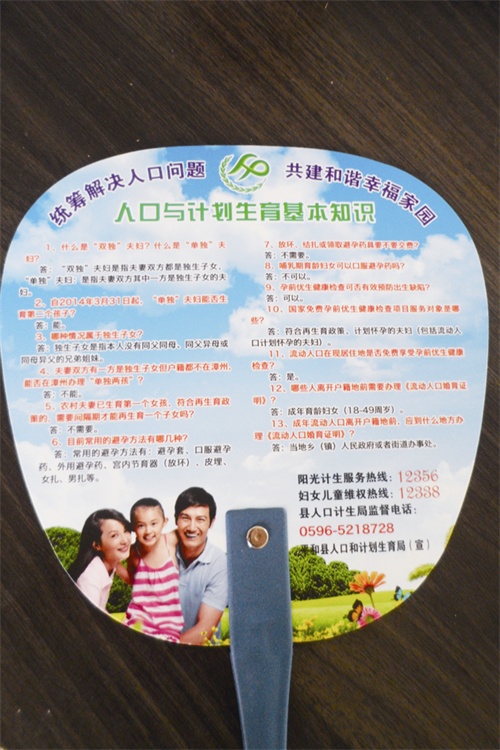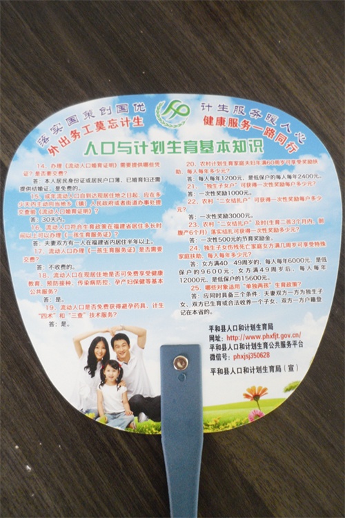 当前,我县在开展创建“全国计划生育优质服务先进县”工作中,特制平和特产蜜柚形状、彩色图文并茂“计生纸扇”7万个,长20厘米、宽18厘米,纸扇两面精心设计25条人口与计划生育基本知识问答题,并印制平和县人口和计划生育局网址、平和县人口和计划生育公共服务微信平台。
