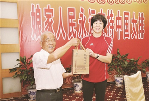 图为中国女排主教练郎平接受“娘家人”的心意。