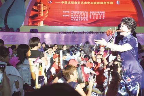 国家一级演员、中国广播说唱团演员温淑萍说,“来到平和感到特别高兴,特别的开心,也是遵照习主席的教导,到人民群众中去;此次特意到观众当中去唱《花好月圆》,就是真正到群众当中去,把欢笑、快乐、愉悦送给老百姓,给他们带去快乐。”