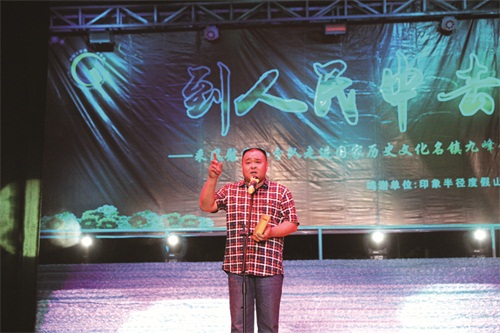 10月16日,“到人民中去”中国文联曲艺艺术中心采风慰问小分队走进九峰,为当地群众送上一出视觉盛宴的文艺大餐。《快板串烧》、《花好月圆》等节目不时赢得观众一阵阵热烈的掌声,不断将演出推向高潮。九峰当地师生更是热情高涨,为现场观众带来了歌曲演唱《玛依拉变奏曲》、诗朗诵《平和的林语堂、世界的林语堂》、小品《竞选村长》等精彩节目,让整场演出在掌声、笑声、欢乐声中进行。