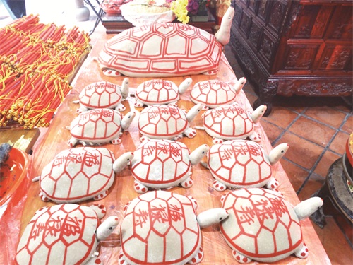 本报讯(罗奇伟 通讯员 曾志煌 文/图)3月13日,平和九峰威惠庙举行开漳圣王1360周年寿诞庆典。当天,信众们精心制作了寿龟、寿桃等丰富的贡品。