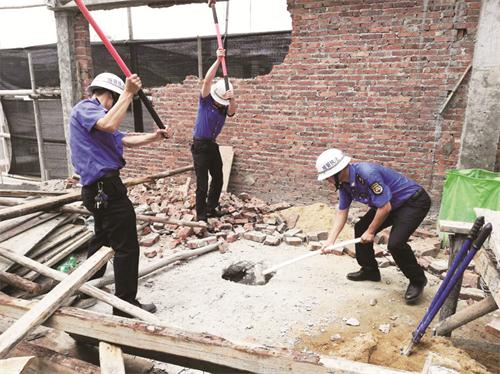 该建筑位于尊府路一巷24号,当地村民在原有房屋的基础上再违规加盖2层,由于超高限部分位于6楼楼顶,大型机械无法进入,执法人员携带锤子、冲击钻、气割枪等工具,对建筑进行破拆,经过连续作业,共拆除建筑面积300多平方米。