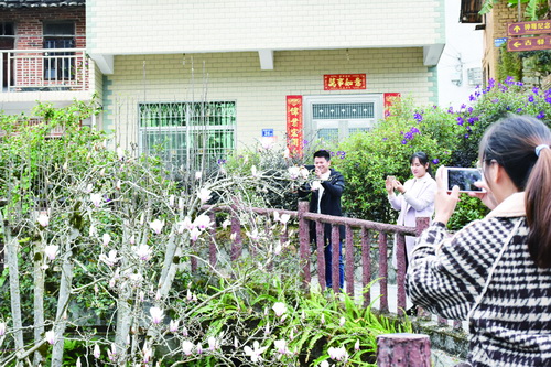 开春时节,笔者在平和县霞寨镇钟腾村的榜眼府前看到一株木笔树,花朵开满枝丫,引得游客纷纷前来观赏。据村党支部书记黄健全介绍,这株木笔树是200多年前武榜眼黄国梁从京城带回的珍贵苗木,每年雨水节气前后盛开花朵,一树雪白,芳香浓郁。 赖伟玲 李嘉琳 摄影报道