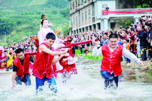 本报讯(绍平 小花 伟芳 湘辉 志平)2月15日,一年一度的“走水尪”活动在花山溪上演。“尪”在闽南语就是“神明”的意思。走水尪就是抬着神像在水里奔跑。村民们在水中闹新春,祈求来年风调雨顺。