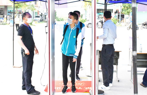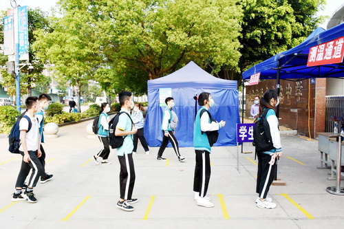 上午7时许,广兆中学迎来了返校复课的500多名九年级学子,学校采取了严格的防控措施,记者在校门口看到,现场设置了2个测温门和1个人工测温通道,所有师生都佩戴好口罩,学生等候入校时,要间隔1米排队,经过体温检测合格后,方能进入校园。