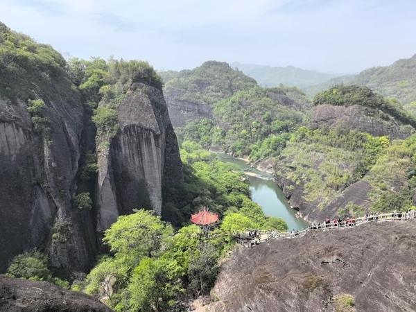 天游峰地处景区中心,东接仙游岩、南续清隐岩、西连仙掌峰,虽海拔仅408.8米,却可以看到九曲溪环绕在丹霞地貌之中,成为俯瞰武夷山水的绝佳之地。