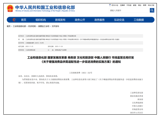 11月26日,工业和信息化部、国家发展改革委、商务部、文化和旅游部、中国人民银行、市场监管总局印发《关于增强消费品供需适配性进一步促进消费的实施方案》(以下简称《方案》)。