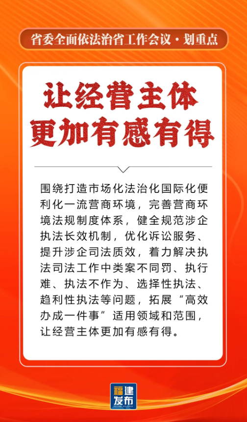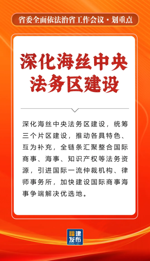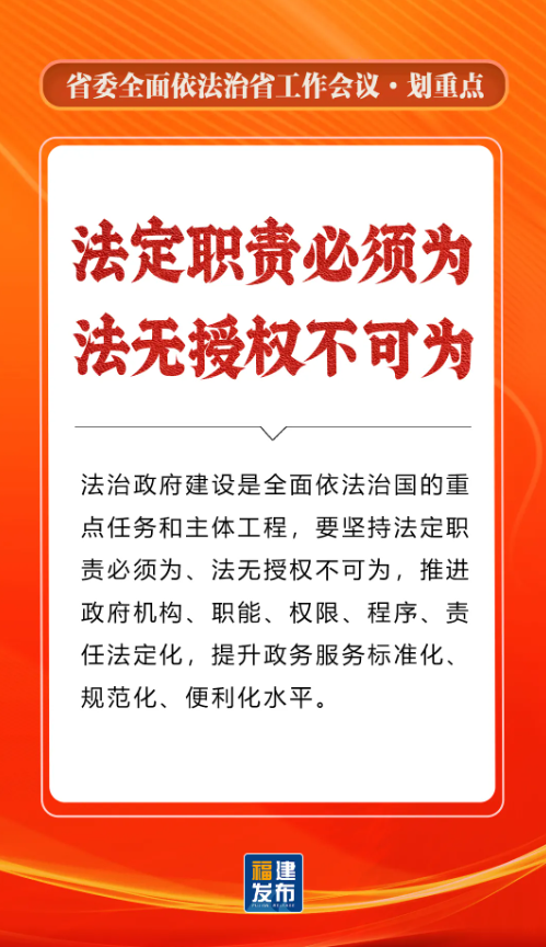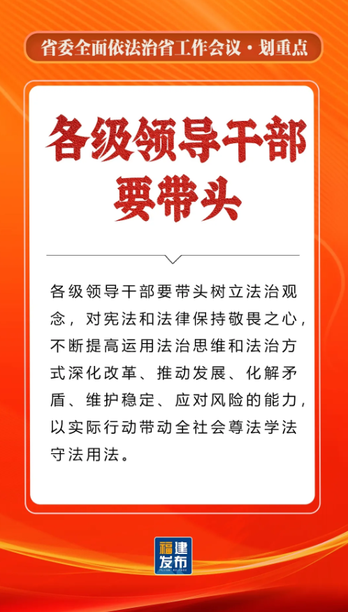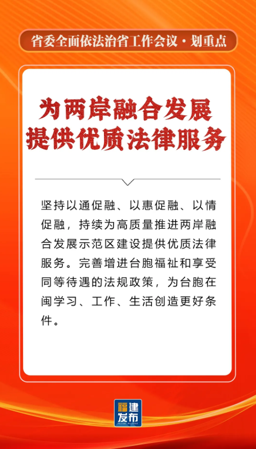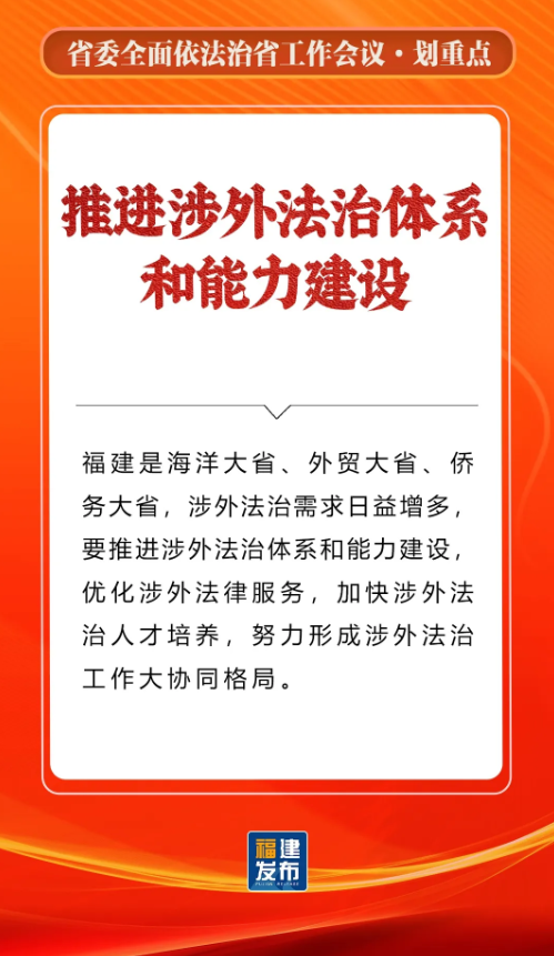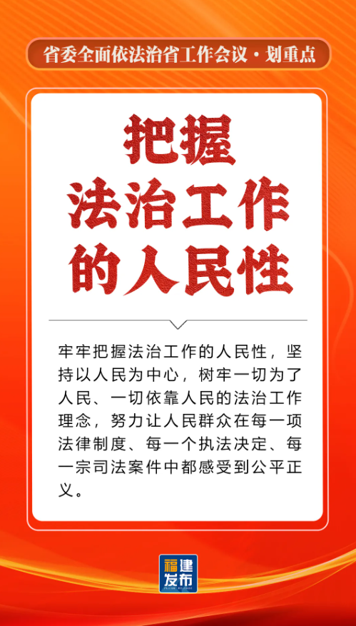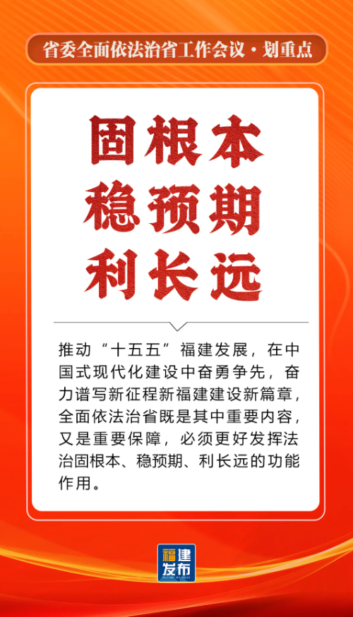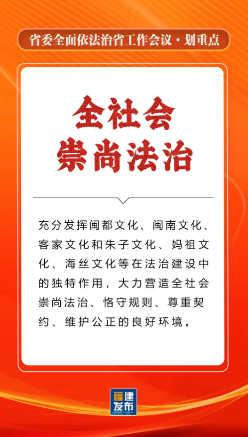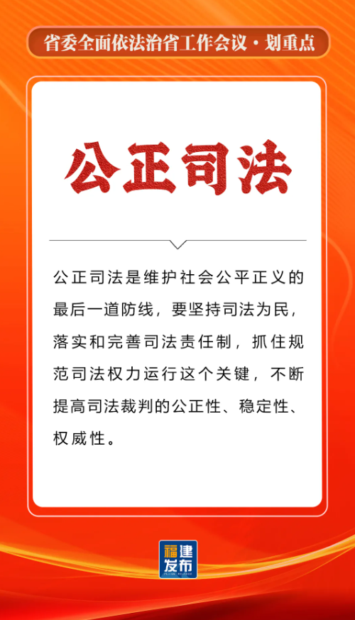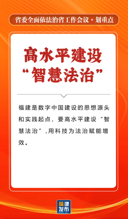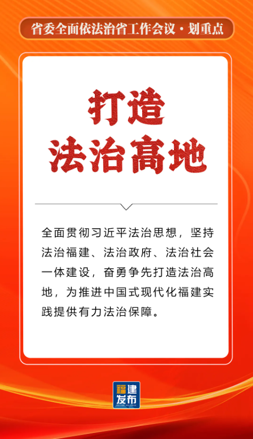 省委书记、省人大常委会主任,省委全面依法治省委员会主任周祖翼出席并讲话,强调“十五五”时期,要全面贯彻习近平法治思想,准确把握新时代新征程全面依法治省工作面临的新形势,牢牢把握法治工作的政治性、人民性、战略性、保障性,坚持法治福建、法治政府、法治社会一体建设,奋勇争先打造法治高地,为推进中国式现代化福建实践提供有力法治保障。