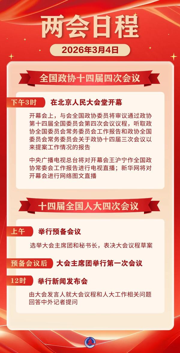 3月4日:全国政协十四届四次会议下午3时开幕 十四届全国人大四次会议举行预备会议
